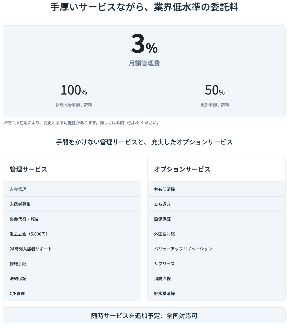 月額管理費は3%となっており、定期点検の実施や建物の状態確認を行います。物件に関するやり取りや報告は専用アプリで行われ、収支報告や各種連絡もペーパーレスで完結。遠方にお住まいのオーナー様でも、状況を把握しやすい仕組みです。