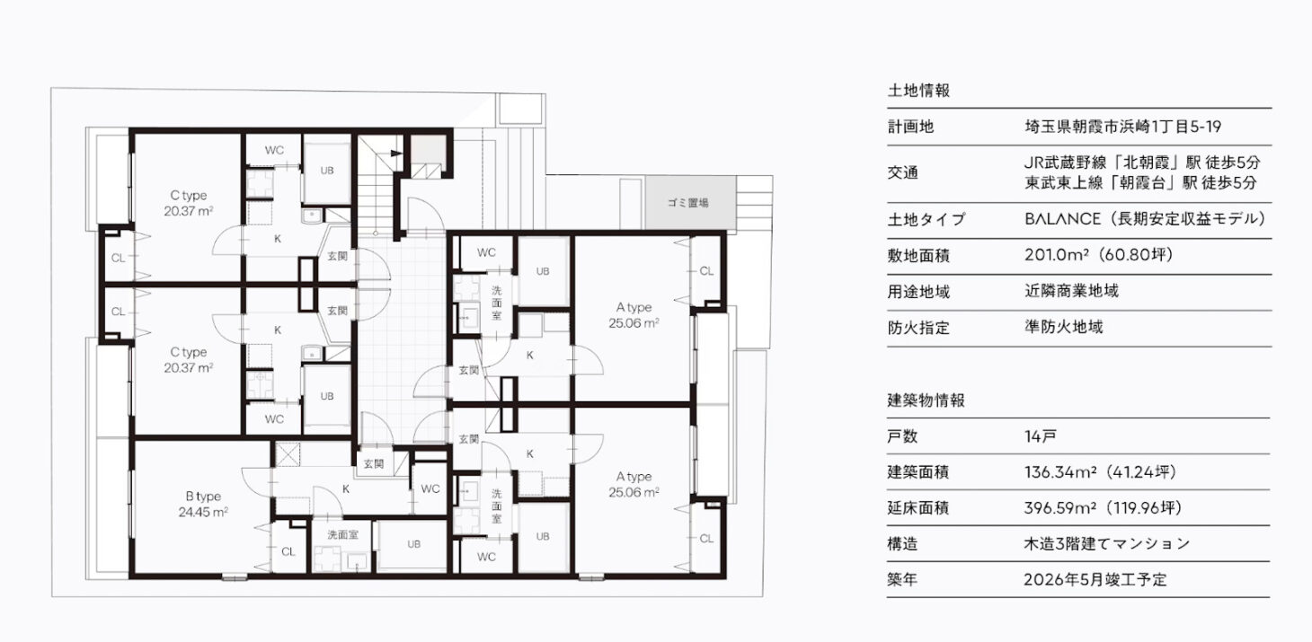 本物件は埼玉県朝霞市・駅徒歩5分という立地に、木造3階建・全14戸で計画されています。