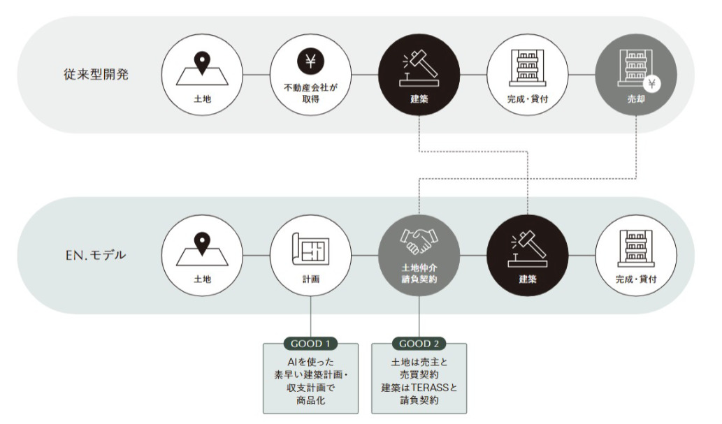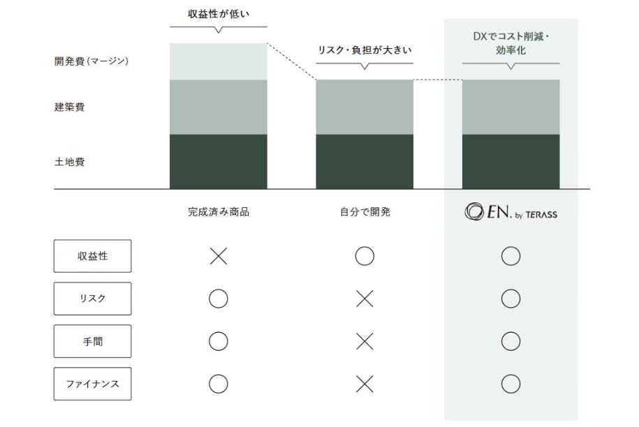 一方EN.は、在庫を持たない受注生産型。開発事業者が抱える在庫コストや中間マージンが積み上がりにくく、その分を収益性に反映しやすい設計になっています。