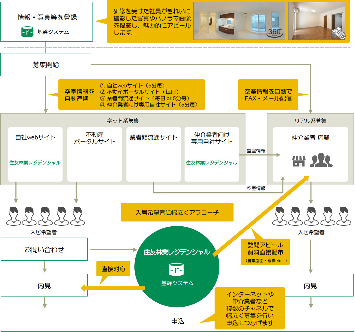 空室の募集を開始する場合は、まず相場や周辺の調査をし募集条件を決定します。そして、正しく魅力の伝わる写真や情報などの“ページの品質”を管理しながら、自社でポータルサイトの掲載まで一貫して実施。仲介会社の募集だけに依存しない募集運用を徹底しています。