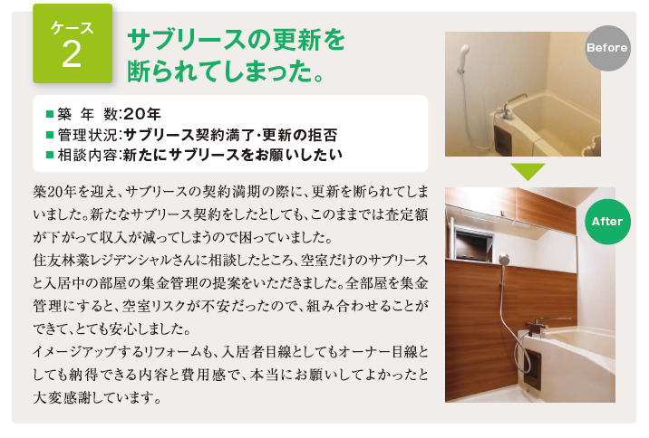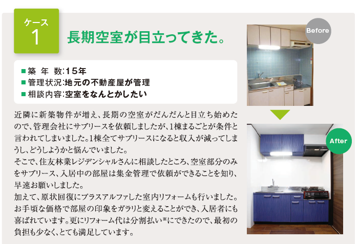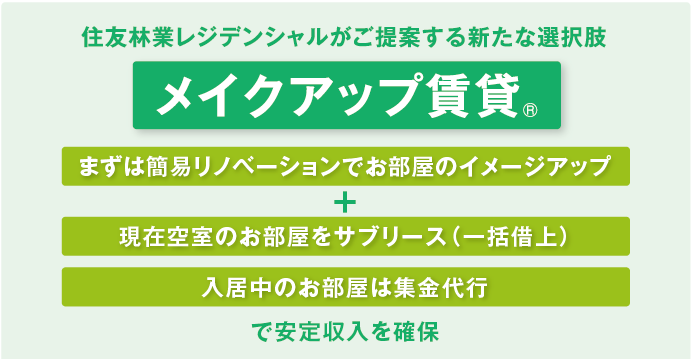 このように、住友林業レジデンシャルでは修繕を行う場合、メイクアップ賃貸、レジノリノ、原状回復パックなど様々なプランをご用意しています。オーナー様の負担を最小限に抑えた上で物件の賃料帯や滞在価値を最適化できる点が、多くの方に支持されています。