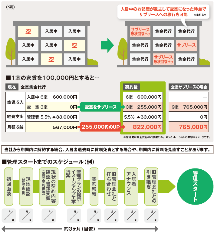 この柔軟な運用により、全室特定賃貸借契約よりもオーナーの手残りが増え、効率的な資産活用を実現します。