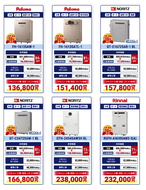 他のガス会社様経由での給湯器の交換となると、主に1台30〜40万円が一般的です。しかし正直屋は10万〜25万円台と、安価でのご提供が可能です。メーカーのカタログ価格よりも最大84%(※)OFFの商品も取り扱っています。(※・・・2025年10月現在の割合・価格となります)