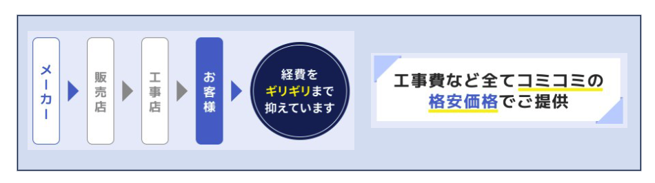 販売店や工事店をはさまず、メーカーから直接大量に仕入れることで、余分なコストを大幅