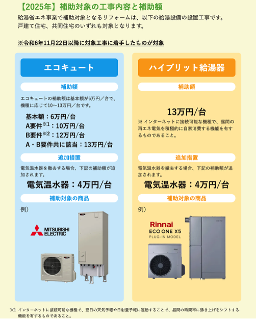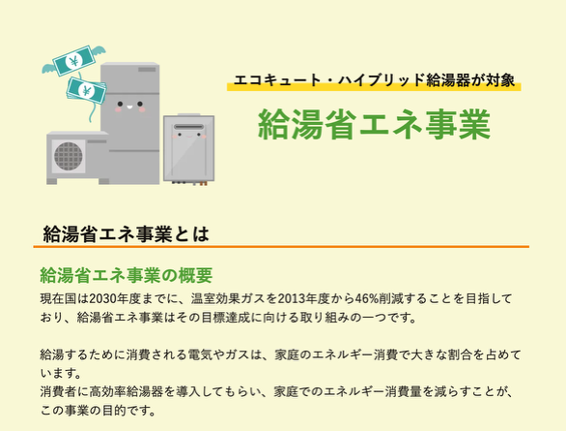 特に高グレードの物件で設置されているケースが多いエコキュート・ハイブリッド給湯器は「給湯省エネ事業」の補助金の対象となります。